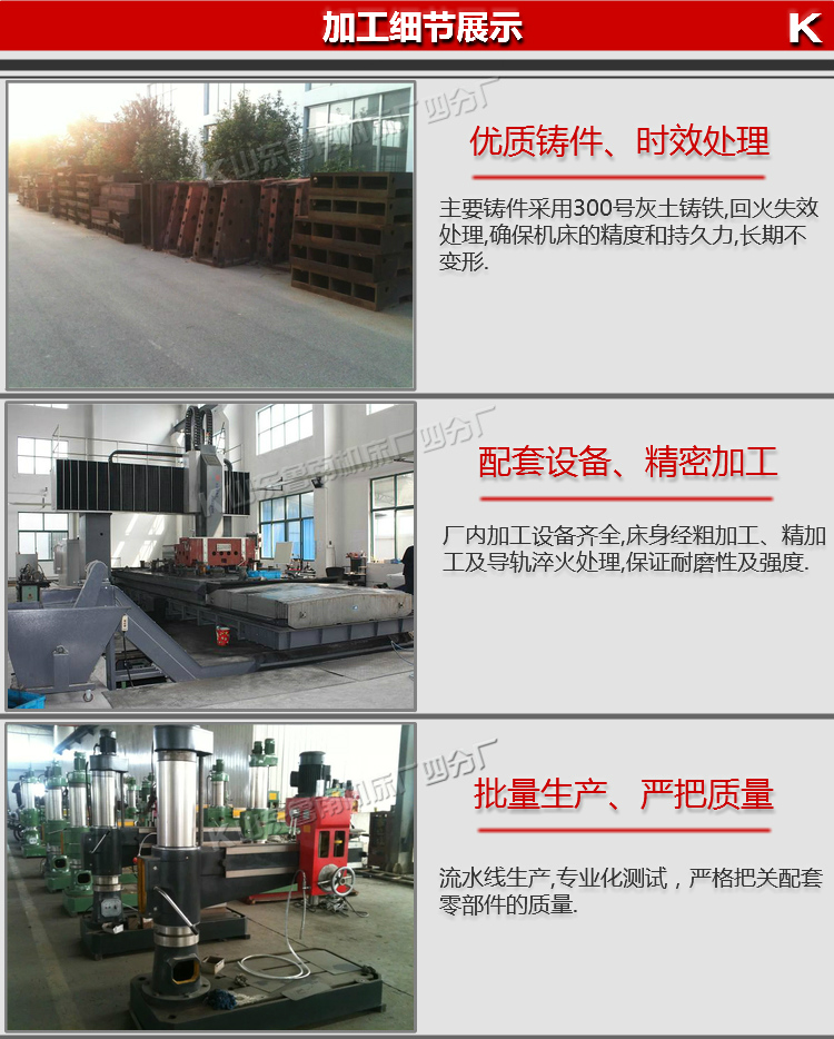 設(shè)備機(jī)身采用優(yōu)質(zhì)樹脂砂鑄造,主要及關(guān)鍵部件選用高強(qiáng)度鑄鐵和特供鋼材。搖臂導(dǎo)軌,外柱圓表面,主軸、主軸套筒及內(nèi)外柱回轉(zhuǎn)滾道等處均進(jìn)行了淬火處理,可長(zhǎng)期保持機(jī)床精度的穩(wěn)定性,延長(zhǎng)了使用壽命。主軸箱、搖臂、內(nèi)外柱采用液壓驅(qū)動(dòng)的菱形塊夾緊機(jī)構(gòu),夾緊可靠。有完善的電器安全保護(hù)裝置和外柱防護(hù)。經(jīng)過專業(yè)化設(shè)備連續(xù)加工,確?;A(chǔ)部件精良和較長(zhǎng)的使用壽命。